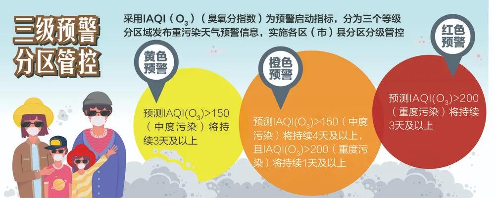 《預(yù)案》分級(jí)標(biāo)準(zhǔn)采用IAQI(O3)(臭氧分指數(shù))為預(yù)警啟動(dòng)指標(biāo),由低到高依次分為黃色預(yù)警、橙色預(yù)警、紅色預(yù)警三個(gè)等級(jí)。同時(shí),根據(jù)各區(qū)(市)縣空氣質(zhì)量實(shí)況和區(qū)域預(yù)測預(yù)報(bào)分析,還新增了分區(qū)域發(fā)布重污染天氣預(yù)警信息,實(shí)施分區(qū)分級(jí)管控。