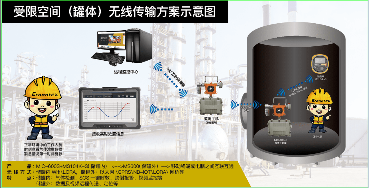 今天,我們就以氣體檢測行業(yè)的老大哥逸云天Eranntex為例,來說說如何進(jìn)行受限空間的氣體檢測。首先,在進(jìn)入受限空間作業(yè)前,工作人員會先用逸云天MIC-600S主機(jī)或泵吸式MS600對受限空間采樣檢測,以檢測密閉空間中的氧氣、硫化氫、可燃?xì)?、VOC揮發(fā)性有機(jī)化合物等。確定安全后,工人才可以進(jìn)入作業(yè)。作業(yè)中,逸云天MIC-600S監(jiān)測主機(jī)在罐體外,將攝像頭架設(shè)在受限空間,工人佩戴一臺逸云天便攜式檢測儀MS600進(jìn)行作業(yè),隨時(shí)檢測所處環(huán)境的氣體濃度狀況,外邊監(jiān)護(hù)人員可通過手機(jī)或ipad進(jìn)行查看監(jiān)測數(shù)據(jù)和視頻圖像,實(shí)現(xiàn)遠(yuǎn)程高風(fēng)險(xiǎn)操作一體化監(jiān)管,徹底解決行業(yè)痛點(diǎn)。