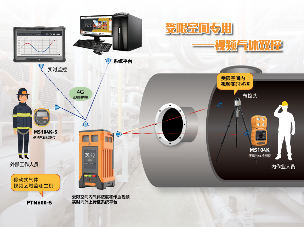 針對(duì)受限空間作業(yè)生產(chǎn)這塊,逸云天推出了無線互聯(lián)受限空間監(jiān)測氣體預(yù)警系統(tǒng)技術(shù)方案——在進(jìn)入受限空間作業(yè)前,作業(yè)人員先用移動(dòng)式PTM600-S對(duì)受限空間進(jìn)行采樣檢測,以檢測密閉空間中的氧氣,硫化氫和可燃?xì)?,也可以檢測密閉空間的VOC揮發(fā)性有機(jī)化合物。確定安全后,工人可以進(jìn)入作業(yè)。作業(yè)中,監(jiān)測主機(jī)在受限空間外,施工工人佩戴一臺(tái)便攜式檢測儀MS104K進(jìn)行作業(yè),隨時(shí)檢測所處環(huán)境的氣體濃度狀況,可布設(shè)防爆攝像頭于內(nèi)部,外邊監(jiān)護(hù)人員可通過手機(jī)或ipad進(jìn)行查看監(jiān)測數(shù)據(jù)和視頻圖像。必要時(shí),可在內(nèi)部增加中繼設(shè)備延長傳輸距離。實(shí)現(xiàn)了遠(yuǎn)程高風(fēng)險(xiǎn)操作一體化監(jiān)管,徹底解決行業(yè)痛點(diǎn)。